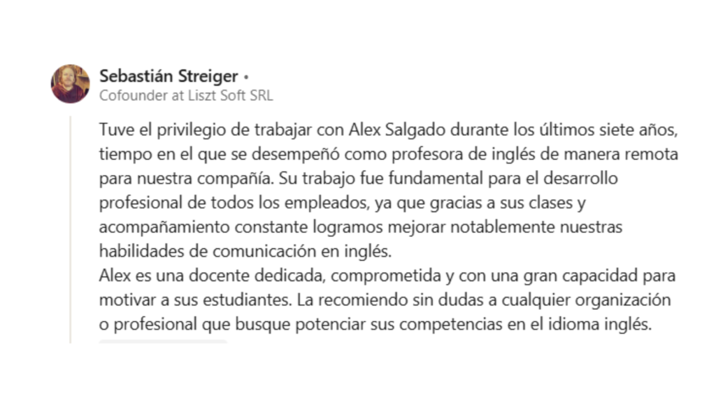 Te ayudamos a potenciar tu crecimiento laboral y profesional y el de tu equipo de trabajo. Nuestro enfoque práctico permite mejorar la comunicación en reuniones, presentaciones y relaciones internacionales, generando impacto real en el desempeño laboral. Te ofrecemos clases online personalizadas individuales o grupales, cada estudiante podrá avanzar de acuerdo a su nivel y sus necesidades.